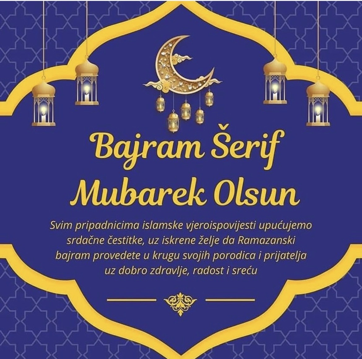 20/03/2026Aktuelnosti, Ostalo Svim pripadnicima islamske vjeroispovijesti upućujemo srdačne čestitke, uz iskrene želje da Ramazanski bajram provedete u krugu svojih porodica i prijatelja uz dobro zdravlje, radost i sreću. Bajram Šerif Mubarek Olsun! 🕌
